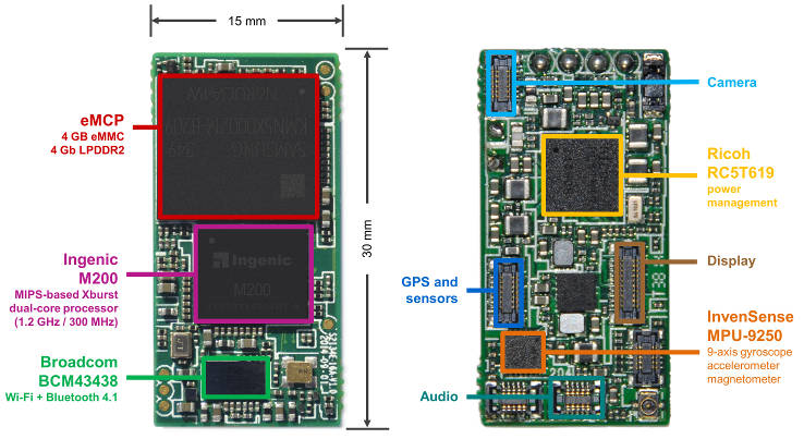 The M200 application processor has two different MIPS cores, one running at 1.2GHz tackles most of the heavy lifting, while a 300MHz MIPS saves power by handling less demanding tasks. They share 512kbyte if L2 cache.