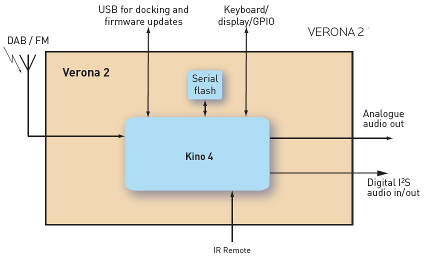 Frontier claims Kino 4 is the first chip for digital broadcast reception which integrates RF, baseband for DAB, DAB+ and FM, a microcontroller, audio decode and digital to analogue conversion on a single piece of silicon. Both digital and analogue audio outputs are included.